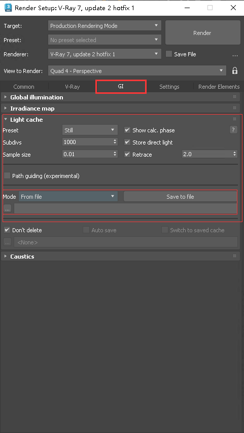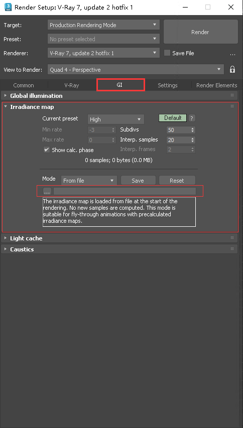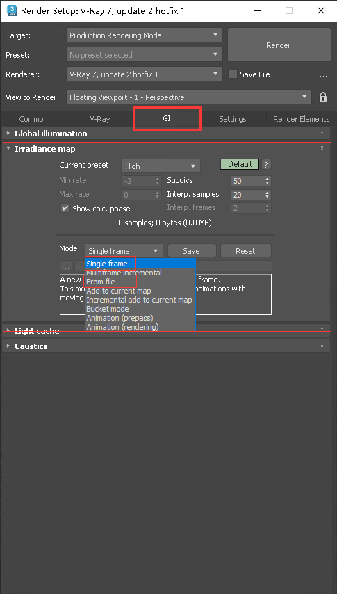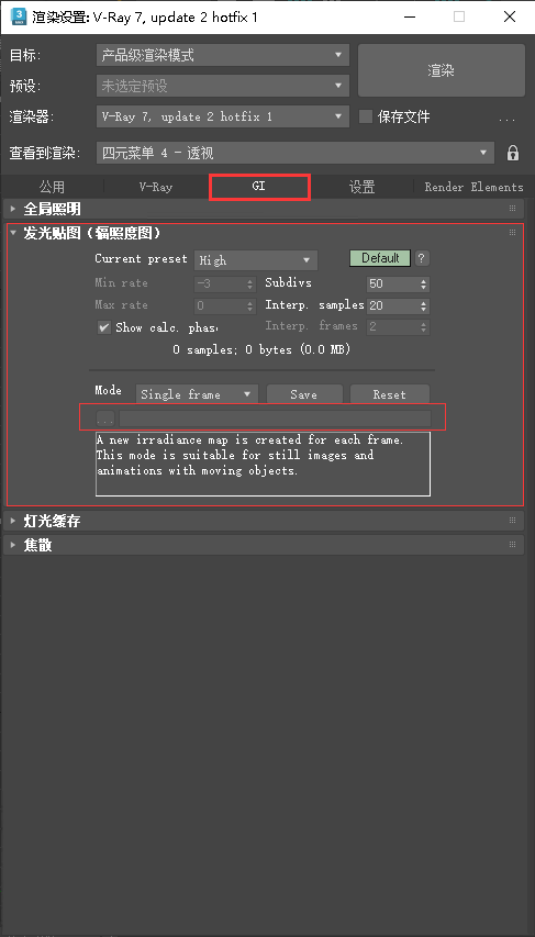 渲染设置(F10)_ GI _ Irradiance Map Settings( 发光贴图)_ mode(模式 ) _ Single frame(单帧)/ From file(从文件)