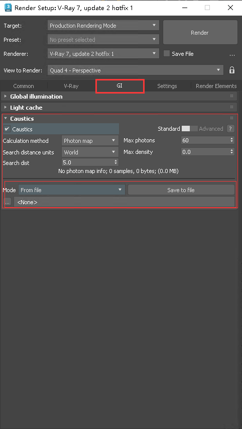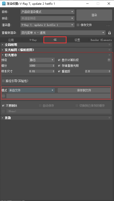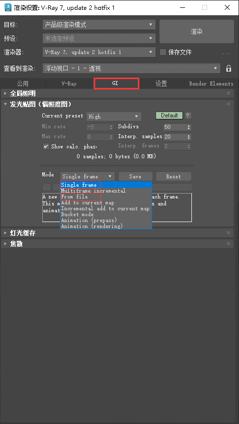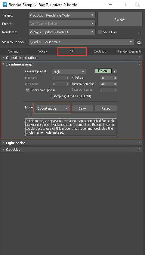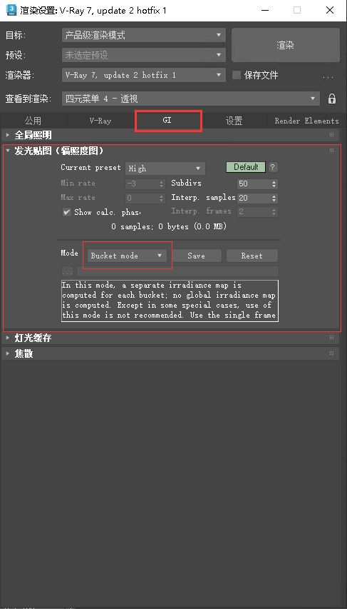 渲染设置(F10)_ 渲染设置(F10)_ GI _ Irradiance Map Settings( 发光贴图)_ mode(模式 ) _ Bucket mode (桶模式) 注:仅支持Single frame (单帧) / From file (从文件)两种模式设置提交