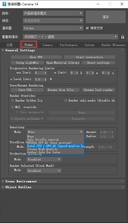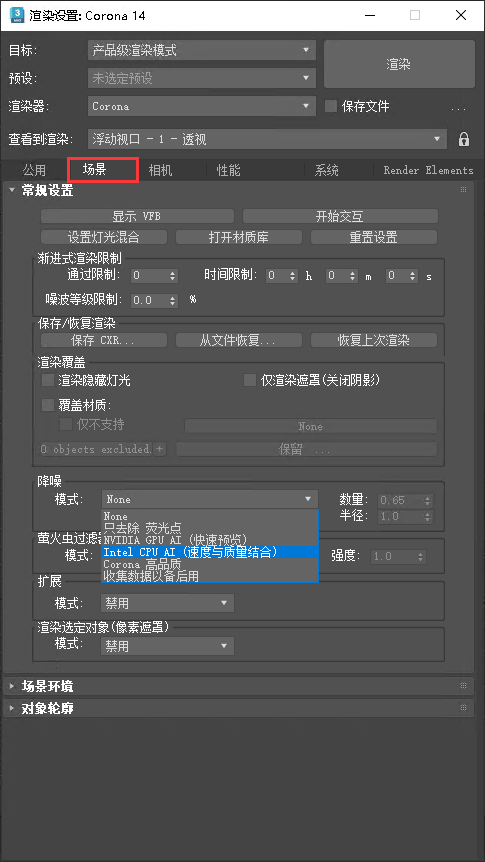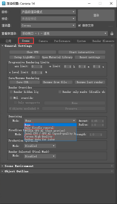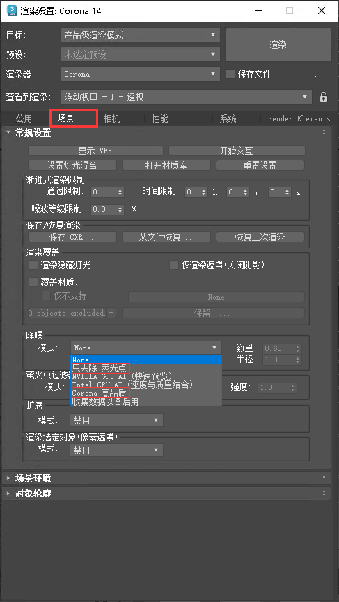 渲染设置(F10)_ scene (场景)_ General Settings (常规设置) _ Denoising (降噪) _ mode (模式)_ None (无) / Only firefly removal (只去除 荧光点) / Corona High Quality (Corona 高质量)
