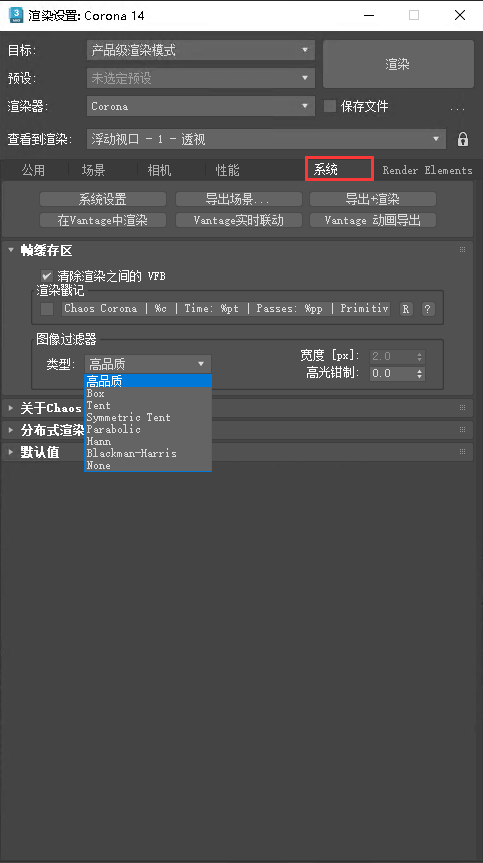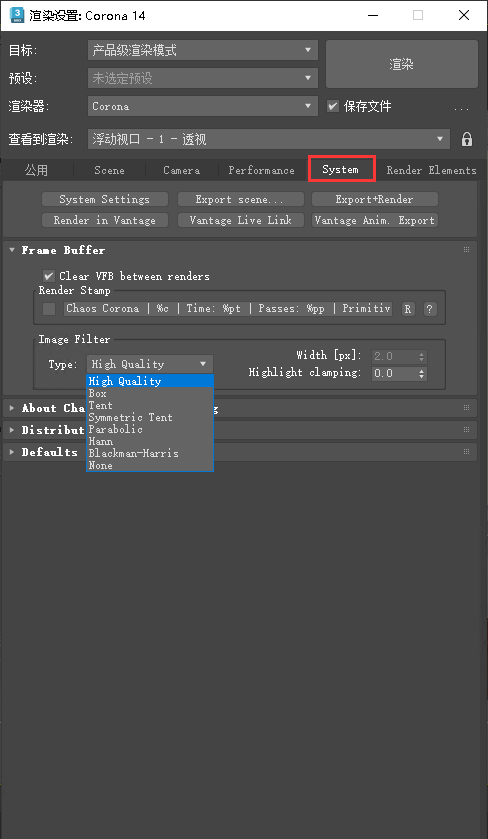 渲染设置(F10)_ System(系统) _ Frame Buffer (帧缓存区)_ Image Filter (图像过滤器) _ type (类型)