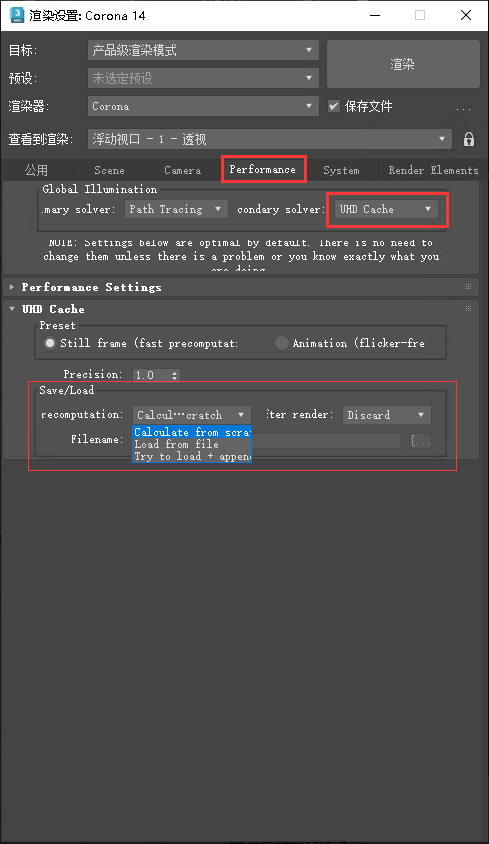 渲染设置(F10)_ Performance(性能)_ UHD Cache(UHD 缓存)_ Save/Load(保存 /加载) _ precomputation (预计算)