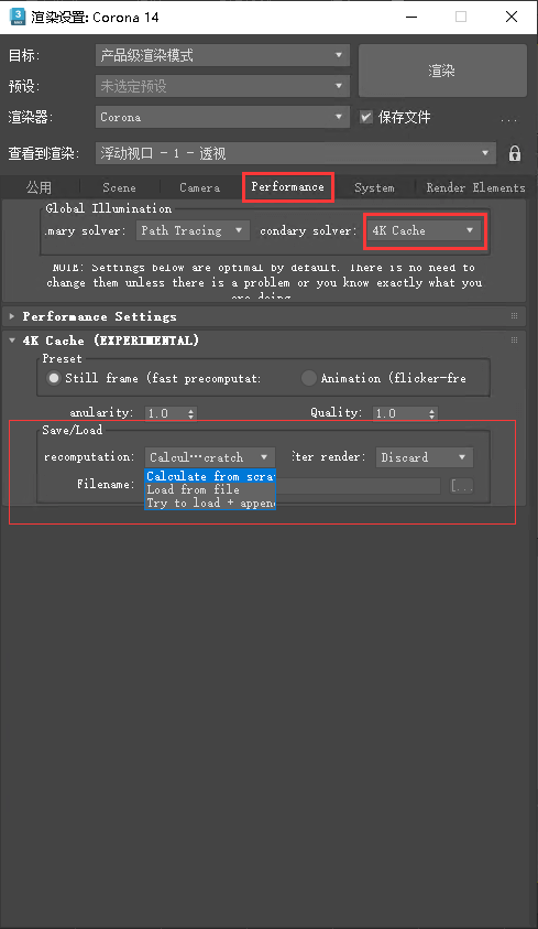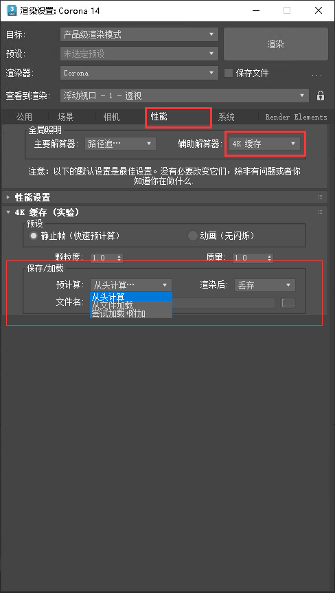 渲染设置(F10)_ Performance(性能)_ 4K Cache(4K 缓存)_ Save/Load(保存 /加载) _ precomputation (预计算)