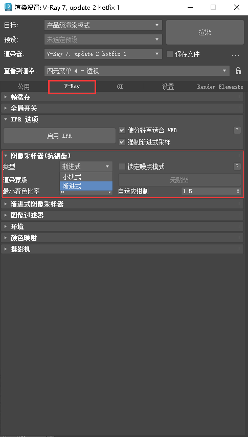 渲染设置(F10)_ V-Ray _Image Sampler(图像采样器)_ Type(类型) _ Progressive(渐进式)