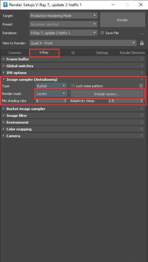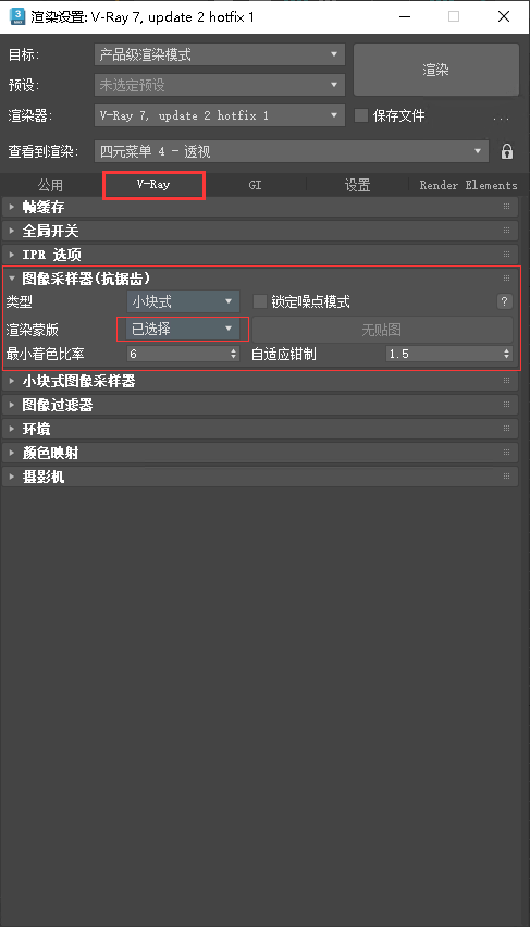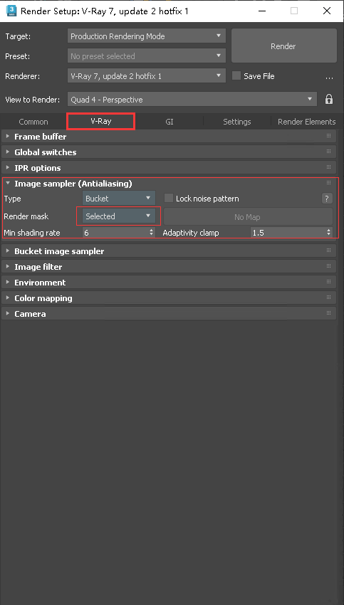 渲染设置(F10) _ V-Ray _ Image Sampler(图像采样器) _ Render mask(渲染蒙版) _ Selected(选定)