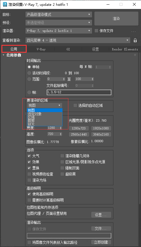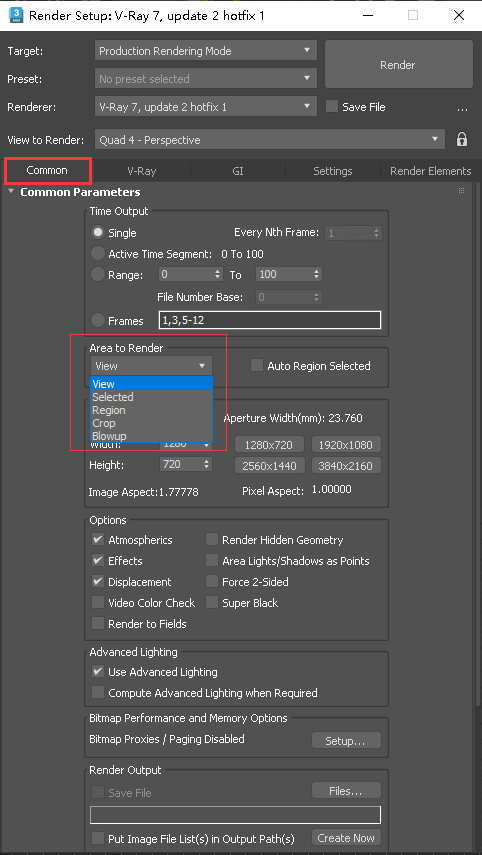 渲染设置(F10)_ Common(公用)_ Area to Render(要渲染的区域) _ View(视图) / Region (区域)