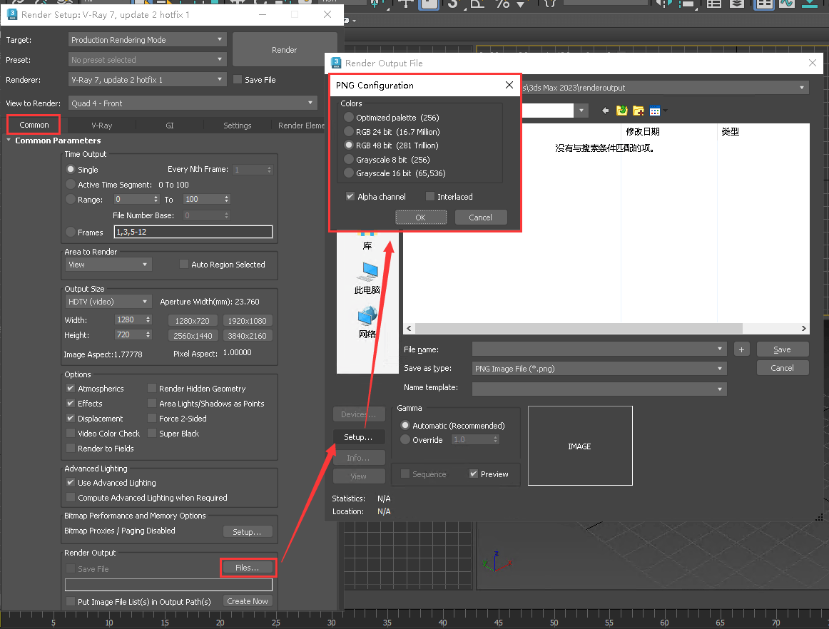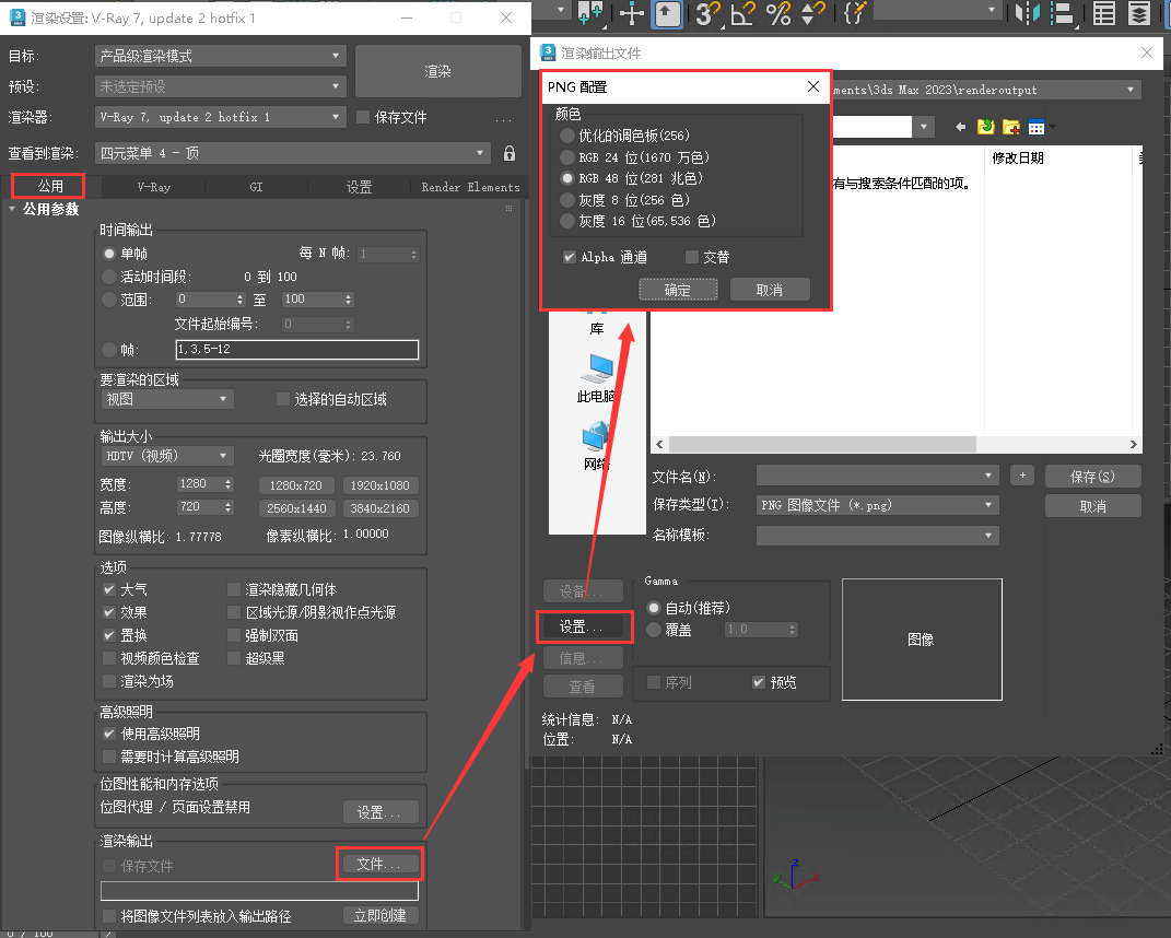 渲染设置(F10)_ Common(公用)_ 渲染输出 (Render Output)_ Render Output File(渲染输出文件) __ setup..(设置..) __ PNG Configuration(PNG 配置)