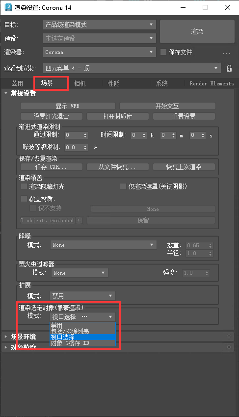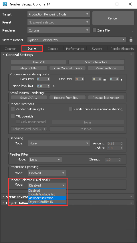 渲染设置(F10)_ scene (场景)_ General Settings (常规设置) _ Render Selected (Pixel Mask) (渲染选定对象(像素遮罩))_ mode(模式) _ Viewport selection(视口选择)
