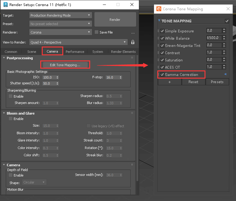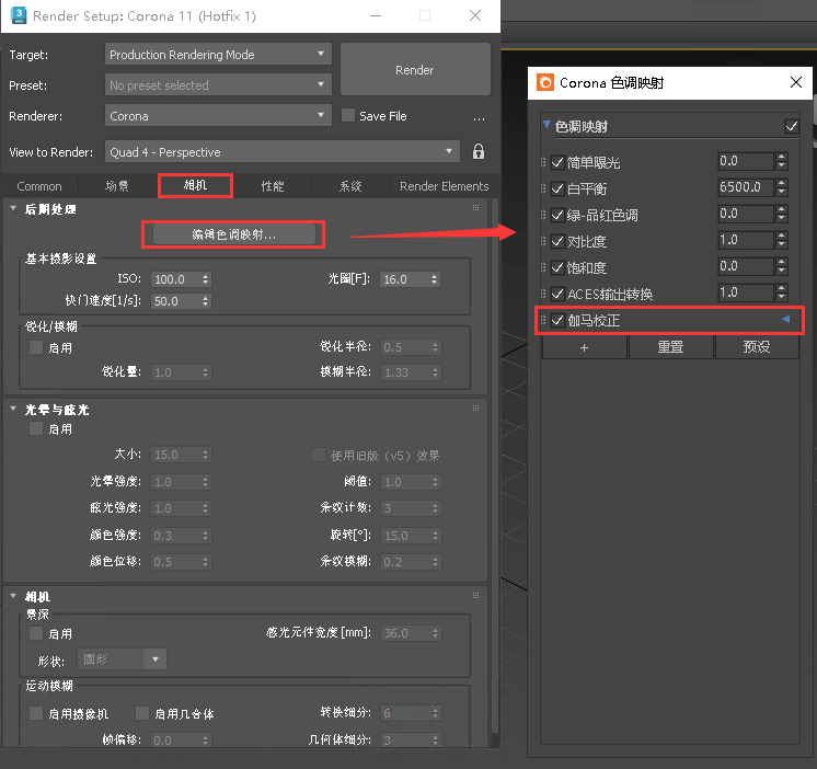 渲染设置(F10)_ Camera (相机)_ _ Edit Tone Mapping.. (编辑色调映射.. )_ Gamma Correction(伽马校正)