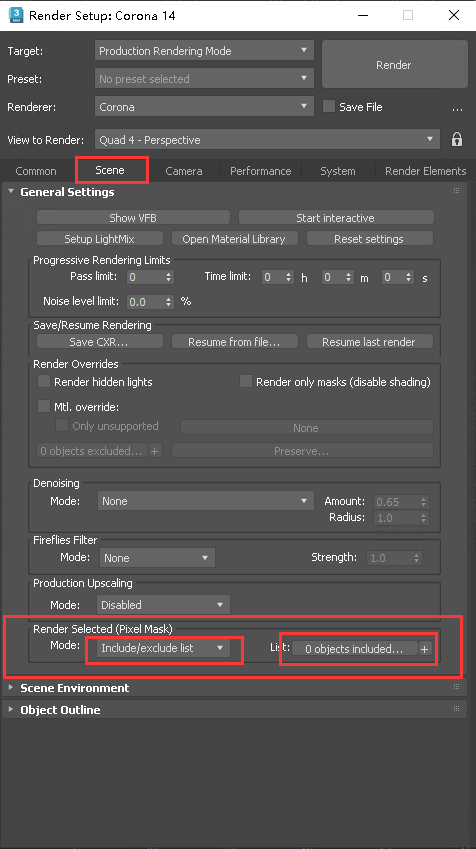 渲染设置(F10)_ scene (场景)_ General Settings (常规设置) _ Render Selected (Pixel Mask) (渲染选定对象(像素遮罩))_ mode(模式) _ Include/Exclude list(包含/排除列表)