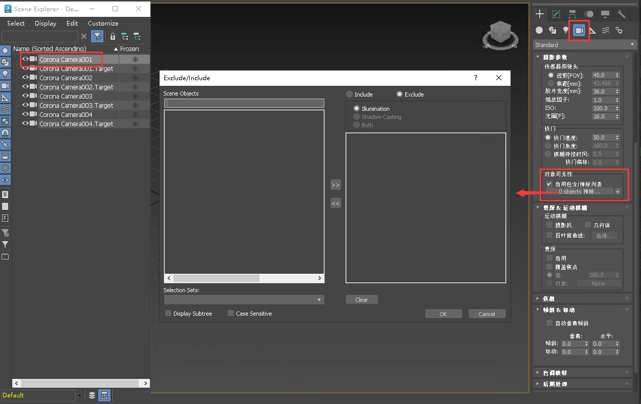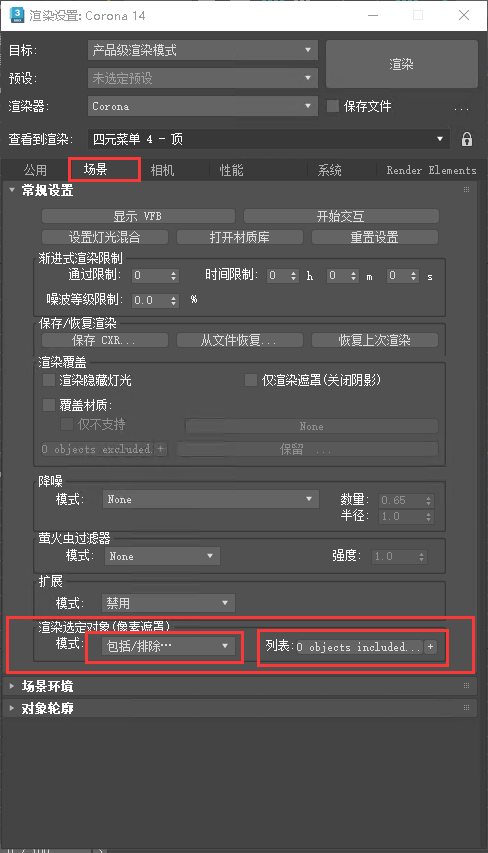 corona渲染器,场景-->常规设置-->渲染选定对象-->包括/排除列表模式,使用的包含功能,但是没有选择包含的节点,会导致出图黑,请修改后提交